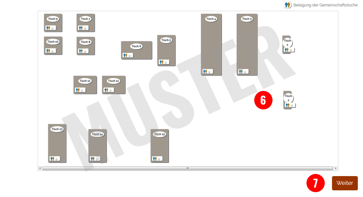 Hinweis: Die Tische, die bereits vergeben sind oder an denen weniger freie Plätze zur Verfügung stehen als Sie reservieren möchten, stehen Ihnen automatisch nicht zur Auswahl bereit.